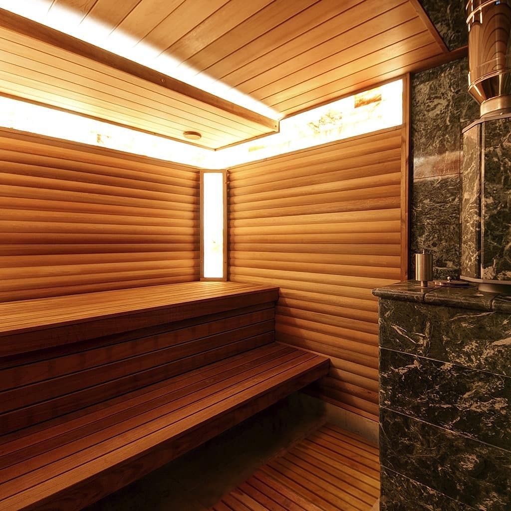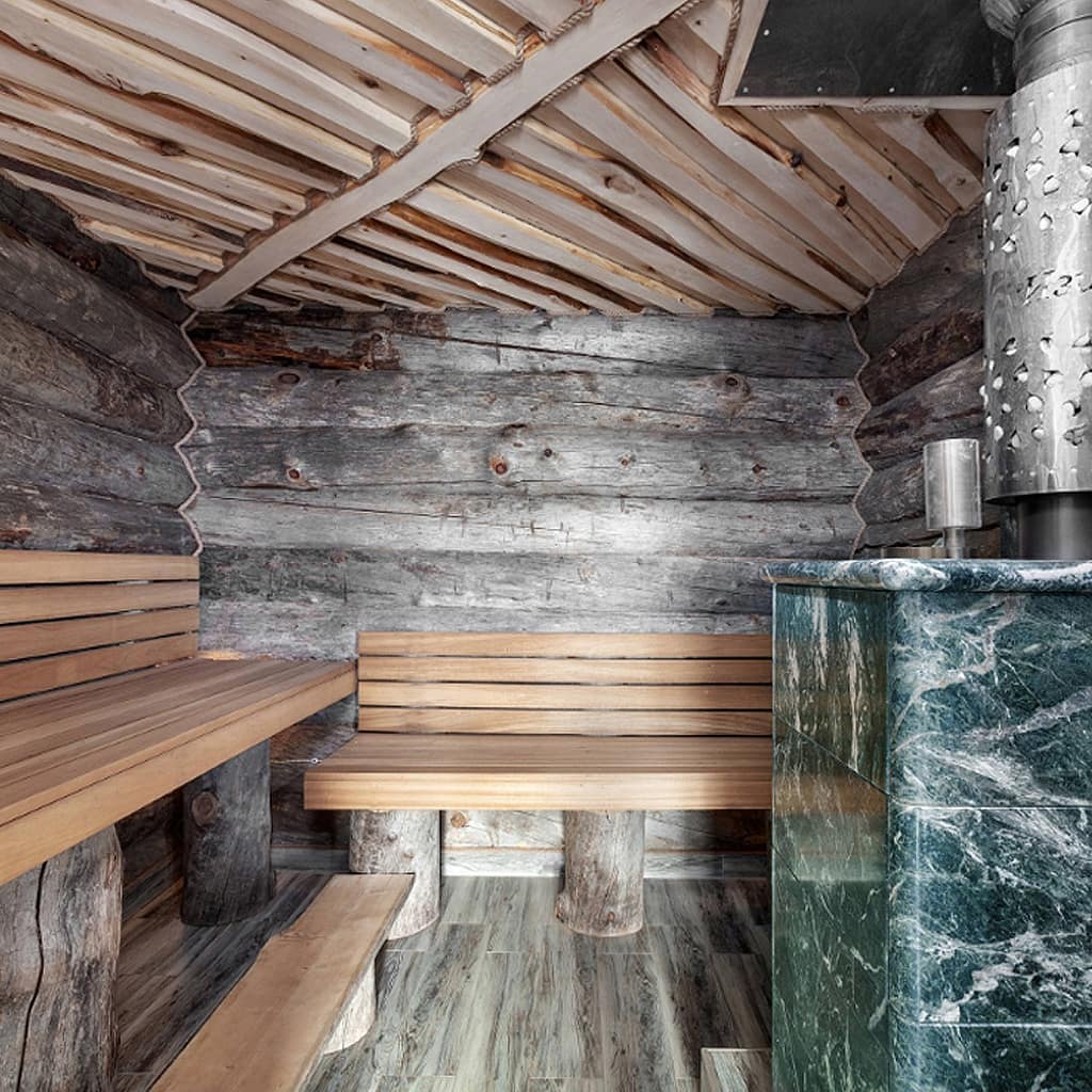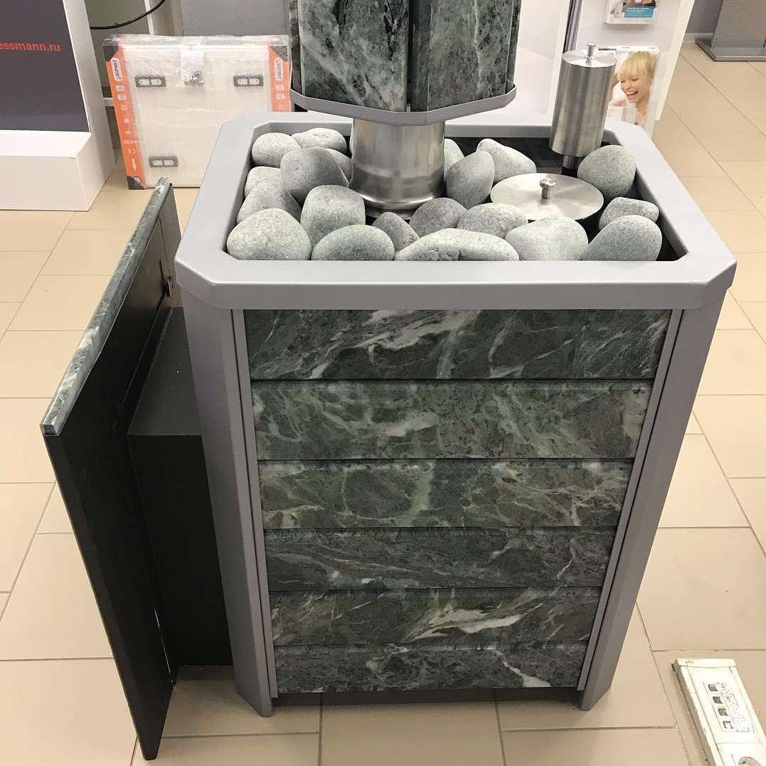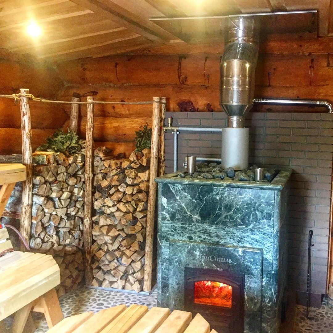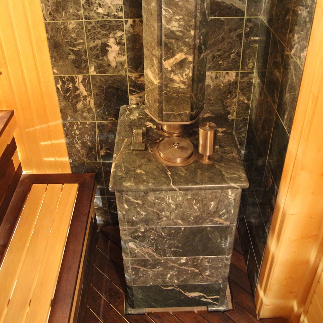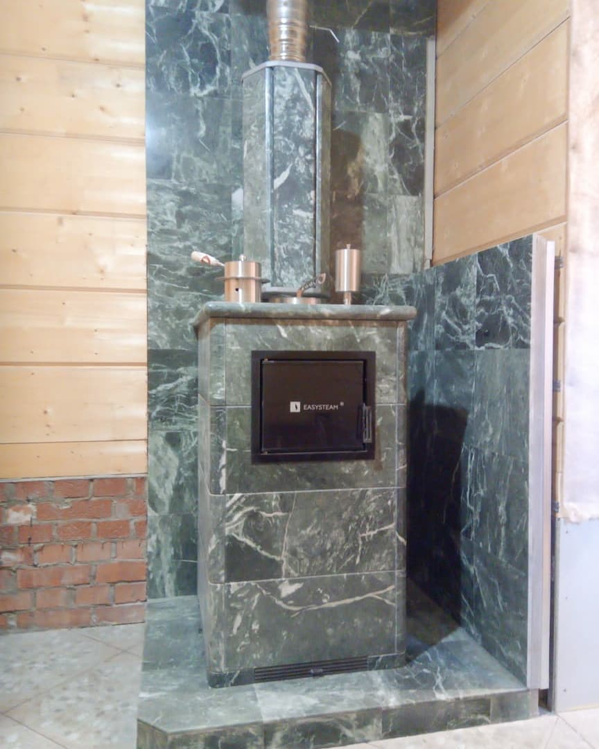 Использование камня в отделке позволяет исключить попадание на поверхность дерева капель горячей воды, за счет этого увеличивается эксплуатационный срок парной.