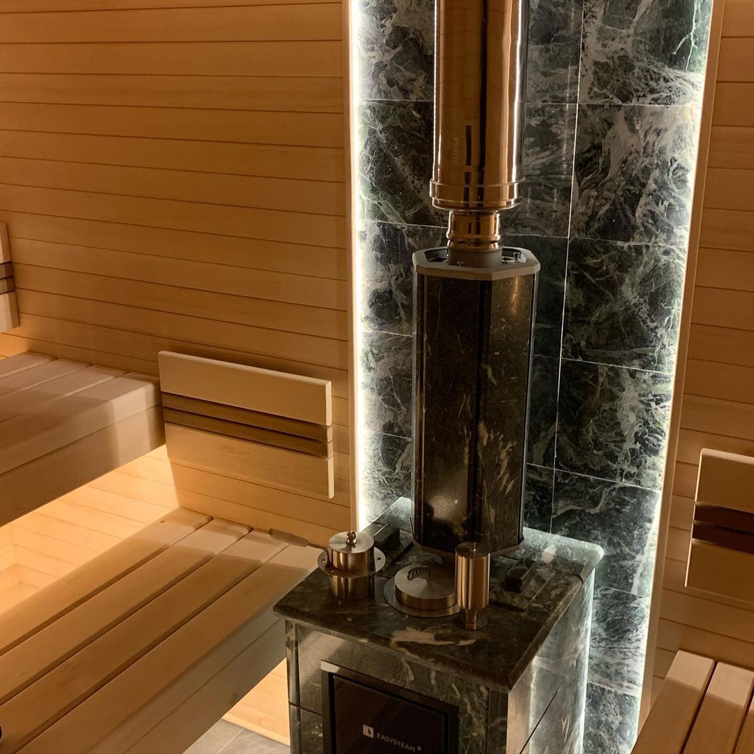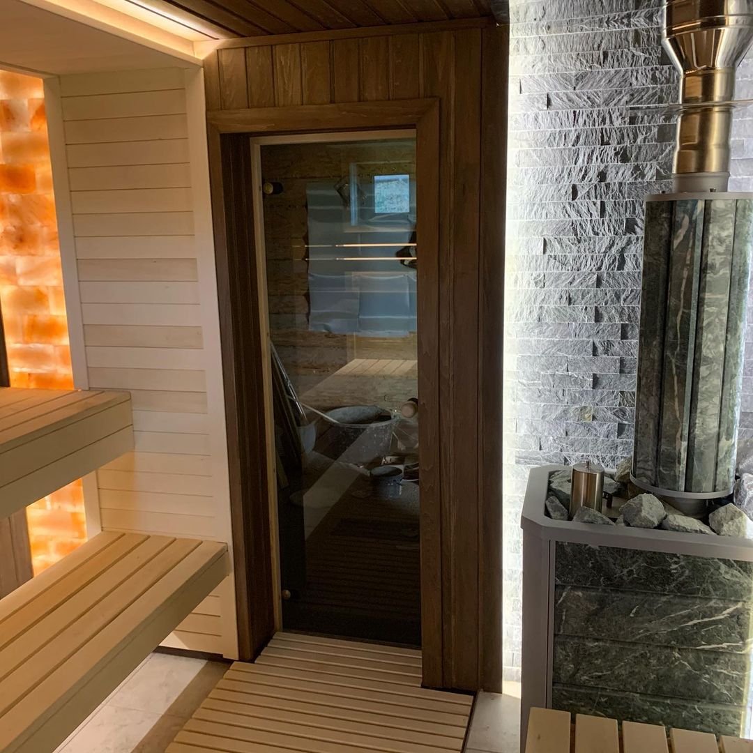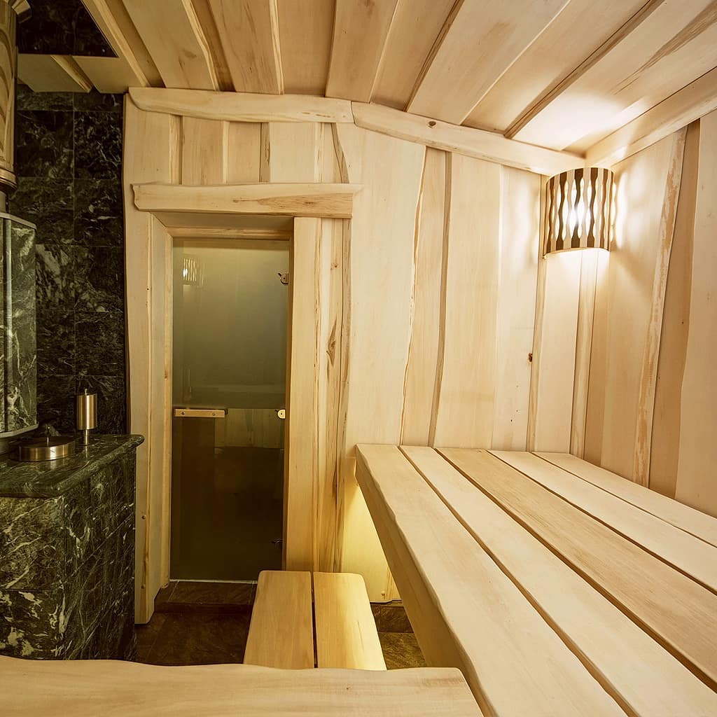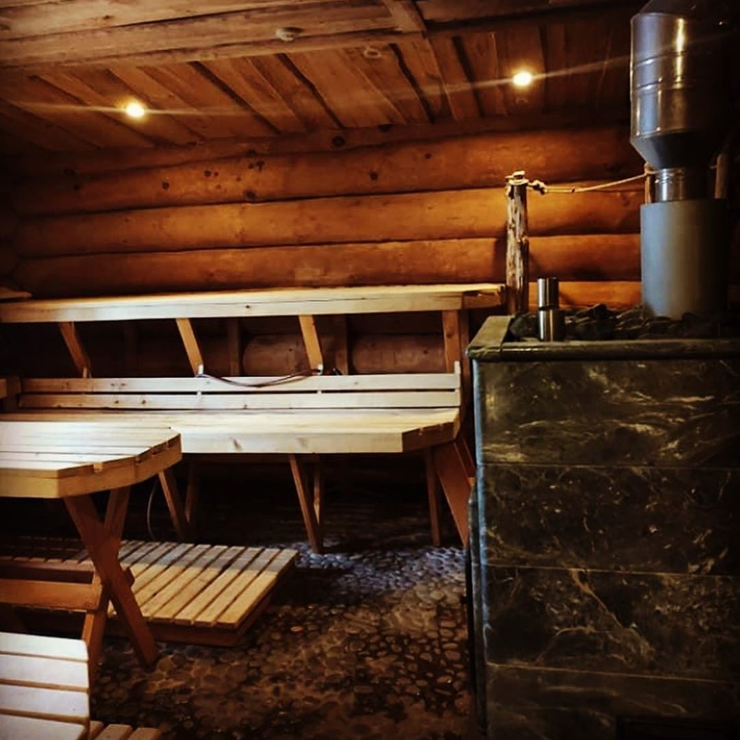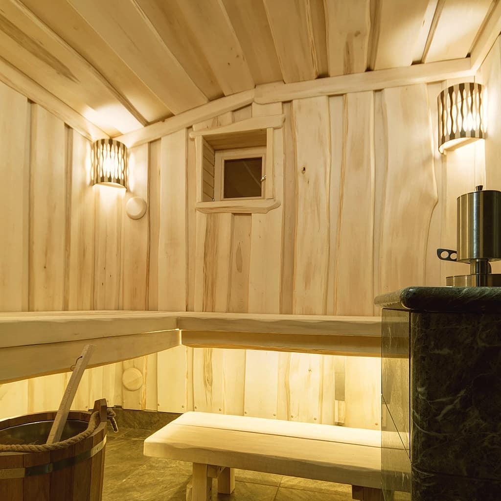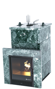 Использование камня в отделке позволяет исключить попадание на поверхность дерева капель горячей воды, за счет этого увеличивается эксплуатационный срок парной.