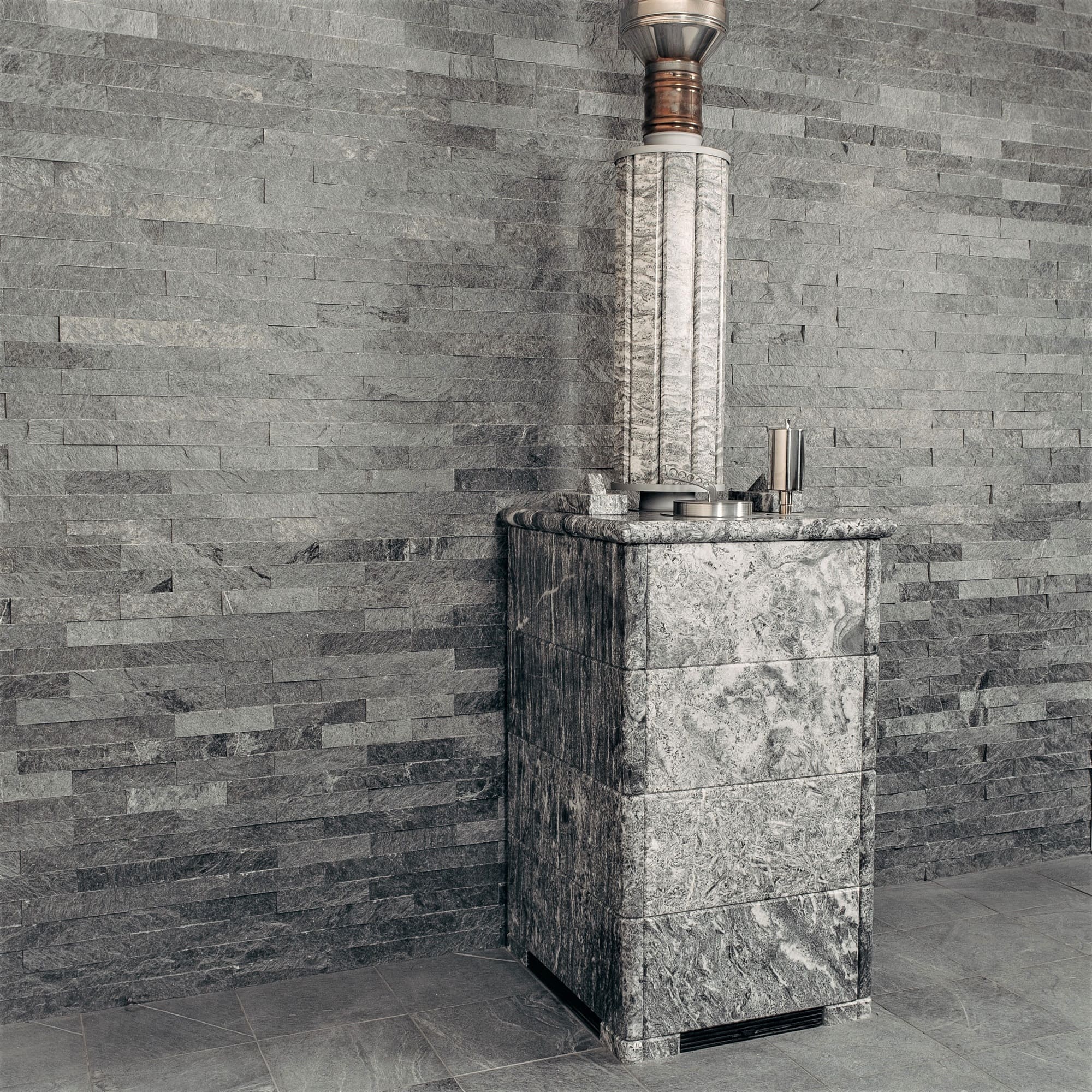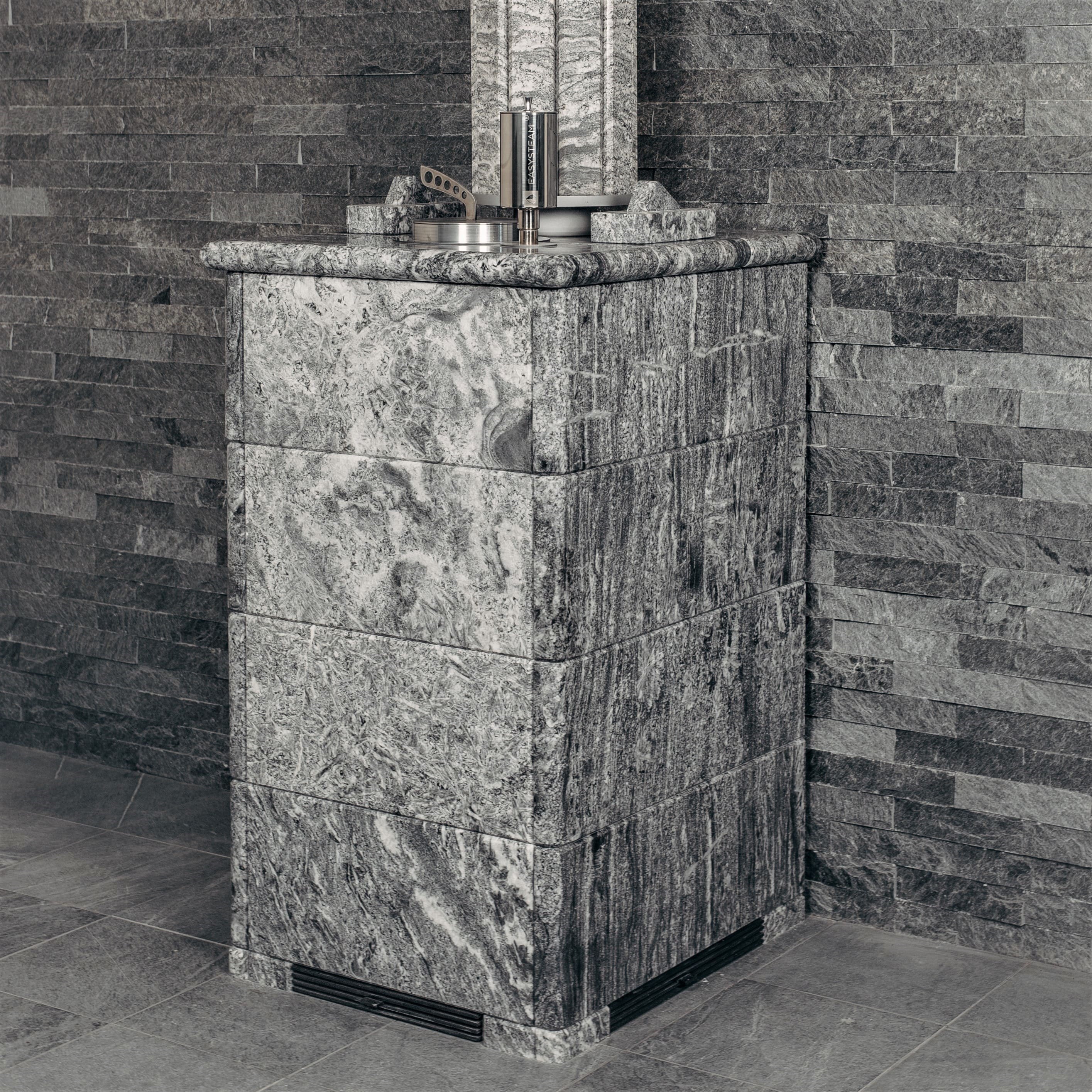 Использование камня в отделке позволяет исключить попадание на поверхность дерева капель горячей воды, за счет этого увеличивается эксплуатационный срок парной.