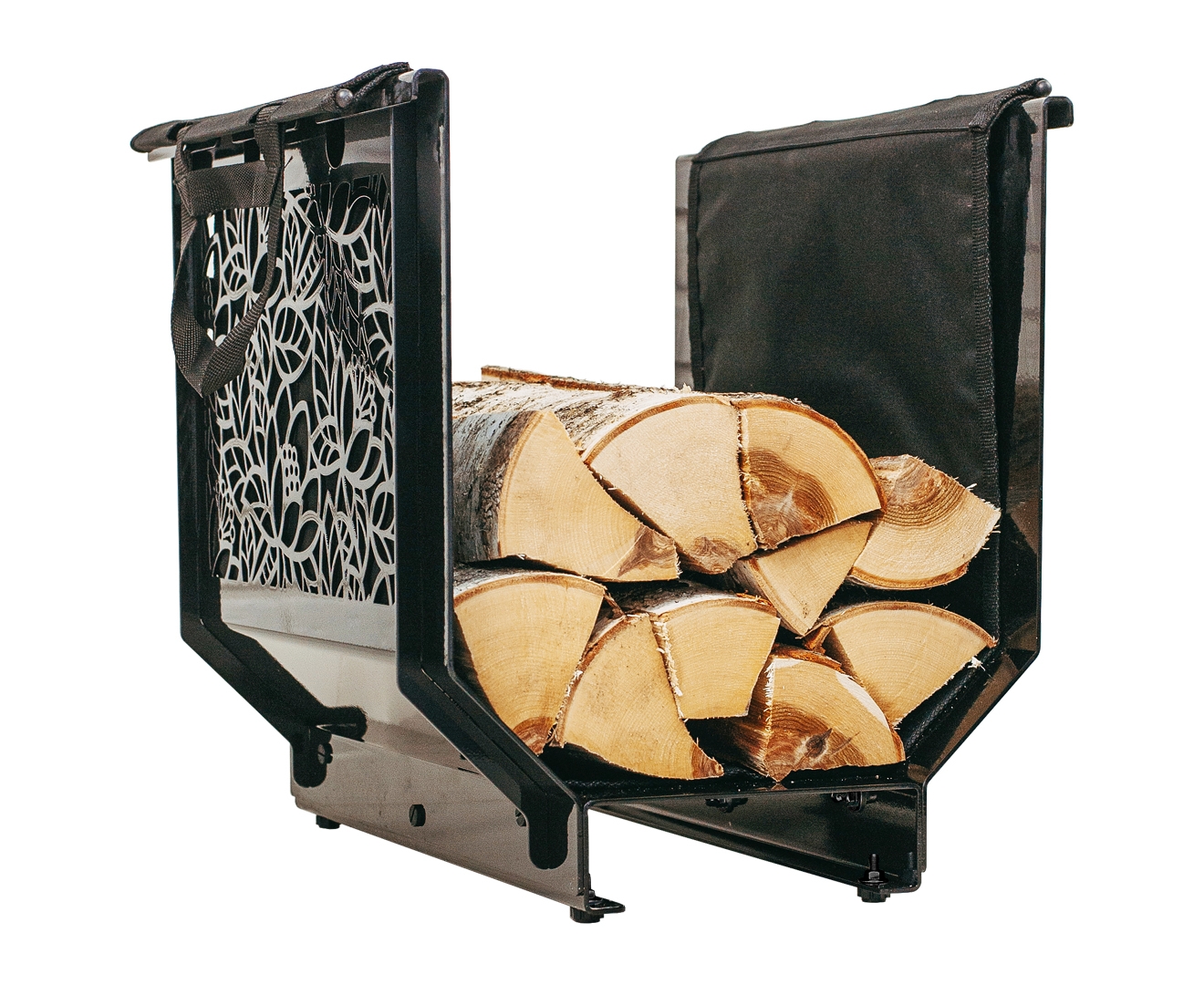 Металлическая дровница с удобной сумкой для переноски дров. Дровница выполнена из металла толщиной 3 мм с порошково-полимерным покрытием. Напольная дровница отличное дополнение в бане или доме для печи, камина и станет удобным местом хранения дров.